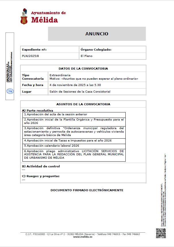 El Ayto de Mélida convoca un Pleno Extraordinario el 4 de noviembre de 2025 a las 5:30 horas en el Salón de Sesiones de la Casa Consistorial.